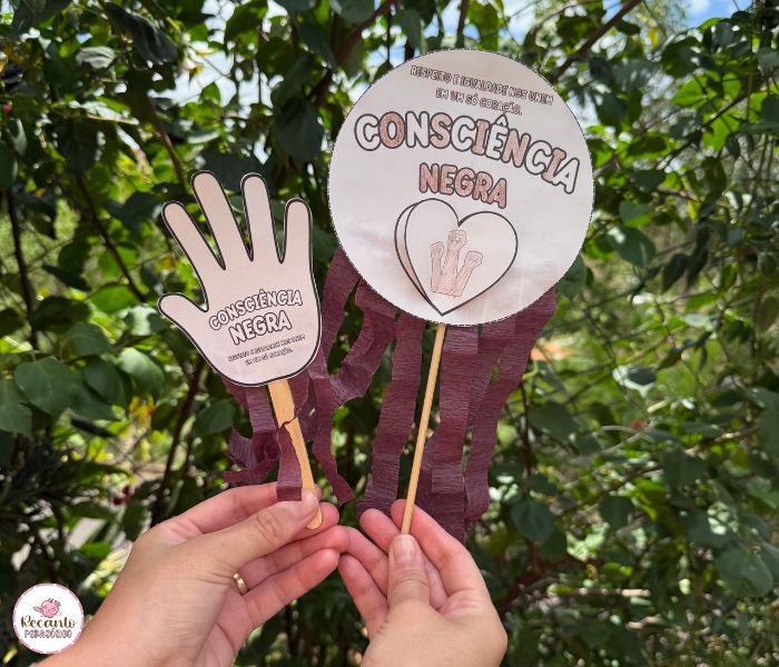 ✨ A montagem pode ser complementada com tiras de papel crepom preto e marrom, representando o tema da Consciência Negra de forma simbólica e delicada.